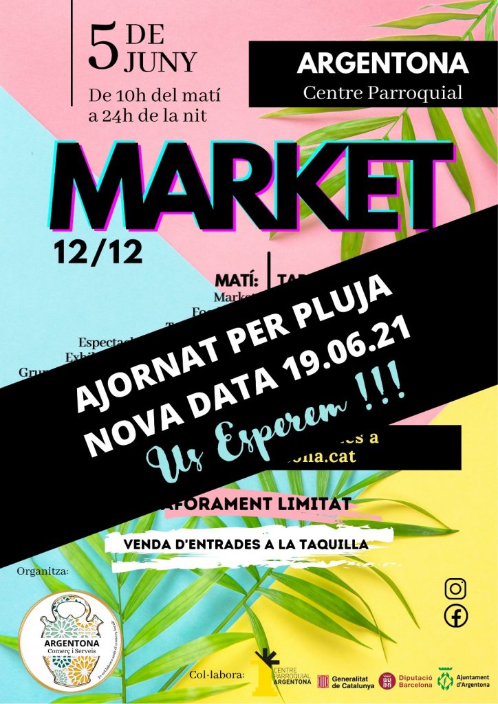 Davant la previsió de pluges per aquest pròxim dissabte de 5 de juny, en veiem obligats a traslladar el MARKET 12/12 al pròxim dissabte 19 de juny.